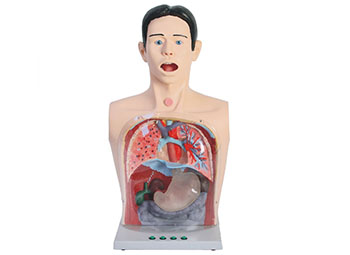 XY-A2高級透明洗胃模型又稱為帶警示透明洗胃機制模型,模型為成年男性上半身,解剖結構精確,包括牙、舌、懸雍垂、氣管、支氣管、左右肺臟、食管、胃、膈、膽囊、胰腺、脾、十二指腸、結腸等結構,胸腹部外皮為透明外殼,便于觀察內部解剖結構以及操作全過程。
