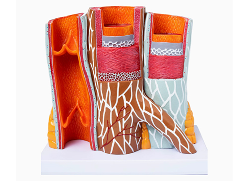 XY-401E動脈與靜脈解剖放大模型顯示動脈和靜脈的立體結構,動脈三層膜比靜脈三層膜厚,動脈有內外彈性膜,而靜脈平滑肌及彈性組織不如動脈,靜脈內孔比動脈內孔大,靜脈有瓣。