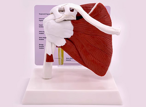 XY-109A肩關節附肌肉模型由上半身的肱骨、鎖骨以及肩胛骨部分組成,顯示正常肩關節的組成和形態結構以及所附的肌肉成分。