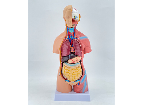 XY-202B(45CM女性軀干模型20件)可拆分為20部件,顯示女性人體內臟器官的位置及頭部解剖的形態和構造,表現呼吸、消化、泌尿,生殖等主要人體解剖系統,頭頸半側顯示顱骨、咬肌、顳肌等結構,眼眶內有眼球,在頭頸部作矢狀切面,示鼻腔、口腔、喉腔、喉室、聲門裂、甲狀旁腺,胸腔內的兩肺額狀切面顯示肺內結構,心臟作冠狀解剖,表示左右房室的構造異同,心臟血管有上下腔靜脈、肺動靜脈、主動脈,供講解大小血液循環應用,模型包含:軀干、頭、眼球、腦、一塊脊椎神經、肺2件、心2件、肝、腎、胃2件、腸4件、女性生殖器官帶胎兒3件。