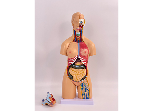 XY-209(55CM兩性軀干模型21件)可拆分為21部件,顯示兩性人體內臟器官的位置及頭部解剖的形態和構造,表現呼吸、消化、泌尿,生殖等主要人體解剖系統,頭頸半側顯示顱骨、咬肌、顳肌等結構,眼眶內有眼球,在頭頸部作矢狀切面,顱腔容納腦的半球,示鼻腔、口腔、喉腔、喉室、聲門裂、甲狀腺,胸腔內的兩肺額狀切面顯示肺內結構,心臟作冠狀解剖,表示左右房室的構造異同,心臟血管有上下腔靜脈、肺動靜脈、主動脈、供講解大小血液循環應用。模型包含:軀干、胸蓋、頭、眼球、腦、脊椎神經、肺2件、心臟2件、肝、膽、腎、胃2件、腸2件、男性生殖器官2件、女性生殖器官2件。
