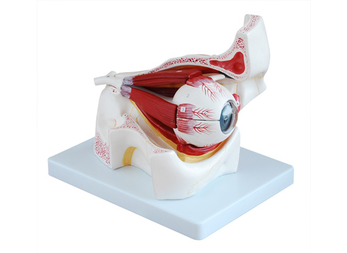 XY-316B眼球與眼眶放大模型在上頜骨上方將眼球水平切,由眼眶、眼球壁鞏膜、上、下半側、晶狀體、玻璃體以及眼球外肌和視神經等10個部件組成,并顯示眼球壁(鞏膜、角膜、虹膜、睫狀體、脈絡膜和視網膜)、眼球內容物、眼球外肌、眼副器以及血管和神經等結構。