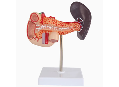 XY-312A胰、十二指腸和脾模型顯示胰的形態(tài)結(jié)構(gòu)(胰頭、胰體、胰尾、胰管、副胰管),十二指腸下部、降部、升部及十二脂腸乳頭、脾臟、腹腔干、肝門靜脈等血管,共有5個部位指示標(biāo)志。