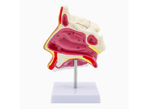 XY-309鼻腔解剖模型顯示了外鼻(示鼻骨及鼻軟骨的切面)、鼻腔(外側(cè)壁有上、中、下三個(gè)鼻甲突入鼻腔,形成上、中、下三個(gè)鼻道)、鼻副竇(示額竇、蝶竇和上頜竇)等結(jié)構(gòu),共有17個(gè)部位指示標(biāo)志。