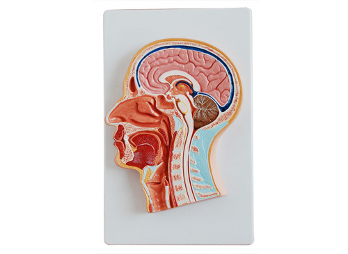 XY-319頭部正中矢狀切面模型頭部作正中矢狀切,顯示腦、脊髓、鼻腔、口腔及咽喉等結(jié)構(gòu)。