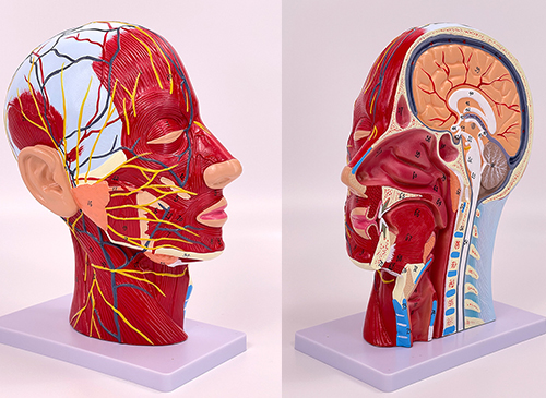 XY-324A頭部正中矢狀切面附血管神經(jīng)模型顯示頭頸部正中矢狀切面內(nèi)、外側(cè)面的局部形態(tài)及其血管和神經(jīng)等結(jié)構(gòu),共有81個(gè)部位指示標(biāo)志。