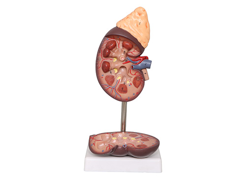 XY-310A腎解剖附腎上腺模型(自然大)可拆分為2部件,顯示了腎剖面的腎皮質(zhì)、腎髓質(zhì)、腎小盞、腎大盞、腎盂、輸尿管以及腎動脈、腎靜脈等結(jié)構(gòu),共有11個部位指示標(biāo)志。