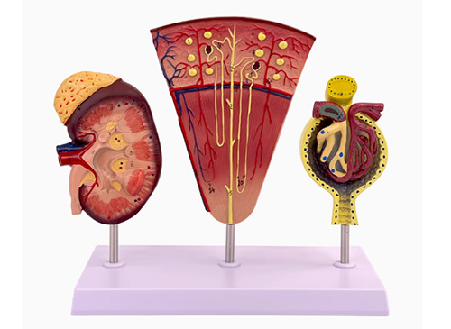 XY-310C腎剖面、腎單位、腎小球模型由腎剖面、腎單位和腎小球3個放大模型組成,顯示腎剖面結(jié)構(gòu)(腎皮質(zhì)、腎髓質(zhì)、近端小管、遠(yuǎn)端小管、髓袢、集合管、乳頭管、腎小盞、腎大盞、腎盂、輸尿管);腎單位結(jié)構(gòu)、腎小體(也稱為腎小球)和腎小管;腎小球結(jié)構(gòu)(由血管球和腎小囊組成,還顯示球旁細(xì)胞,致密斑和足細(xì)胞)以及血管等結(jié)構(gòu)。