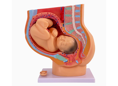 XY-332D女性妊娠盆腔矢狀解剖模型展示了妊娠40周的女性骨盆矢狀切面,胎兒可取出,顯示了胎兒出生前的正確胎位以及女性泌尿生殖系統等,底座上還安有一個3個月大的胚胎模型。