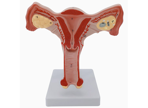 XY-436子宮解剖放大模型顯示子宮三層結構,子宮腔陰道示穹隆,左側示卵巢、輸卵管各部和子宮闊韌帶的關系,右側卵巢剖面示黃體、卵泡、子宮血管及子宮圓韌帶等。