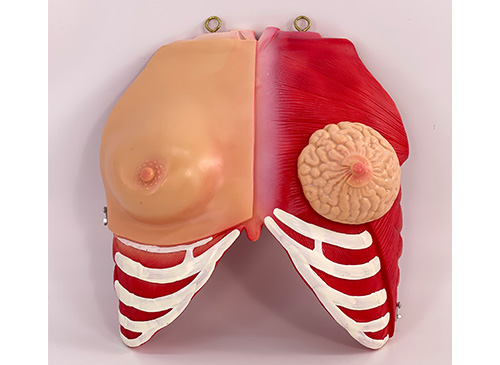 XY-314乳房解剖模型右側(cè)示乳房的外形,中心為乳頭,周圍為乳暈及其乳暈腺,左側(cè)示解剖面乳房的構(gòu)造、乳腺、乳房小葉、輸乳管、輸乳管竇、輸乳孔以及乳房脂肪、胸骨等內(nèi)外面結(jié)構(gòu)。