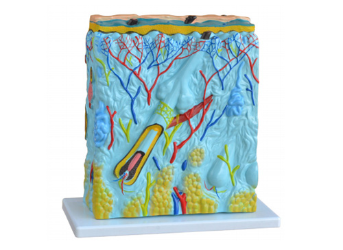 XY-313皮膚立體結(jié)構(gòu)模型(105倍)為放大105倍的人體皮膚的橫截面模型,由表皮、真皮、皮下組織三層皮膚結(jié)構(gòu)組成,顯示頭發(fā)毛囊、汗腺、脂肪組織等皮膚附屬器的主要結(jié)構(gòu)。