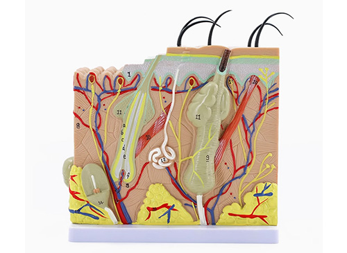 XY-313A皮膚放大模型(70倍)放大70倍,顯示了不同層面的人類皮膚層次及毛發結構,展示了毛發、毛囊、脂腺、汗腺、皮膚感受器、神經和血管,置于基板上,共有多個部位指示標志。