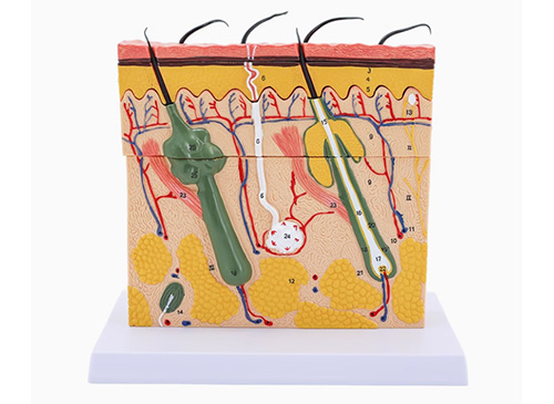 XY-313C皮膚層次切面模型(70倍)由表皮和真皮組成,借皮下組織與深層組織相連,并顯示表皮、真皮組織層次結構以及皮下組織和皮膚附屬器(包括毛、皮脂腺、汗腺和神經末梢)等結構,共有多個部位指示標志。